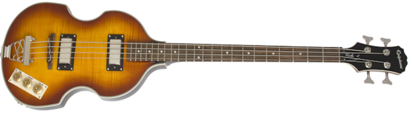 Eh oui ! So british l'Epiphone Viola Bass qui n'est pas sans rappeler un célèbre modèle de chez Hofner jouée par l'également célèbre bassiste des Beatles.