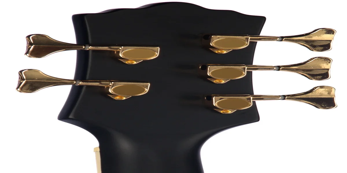 L'identité visuelle de la Eastwood Classic 5 SEYE Signature est particulièrement frappante. Seye Adelekan a spécifiquement demandé une finition noire mate et des accessoires dorés, des éléments qui étaient des nouveautés pour ce modèle et qui lui confèrent une élégance discrète mais percutante. Le corps semi-creux, un élément central de son identité, est fabriqué en érable laminé et dispose de ouïes en F cerclées. Cette construction, héritée du modèle Classic 4, est la base de sa résonance et de son caractère tonal chaleureux. L'instrument est également doté de touches distinctives en forme de "dents de requin" sur la touche en palissandre, un détail visuel unique qui la différencie et renforce son allure rétro.