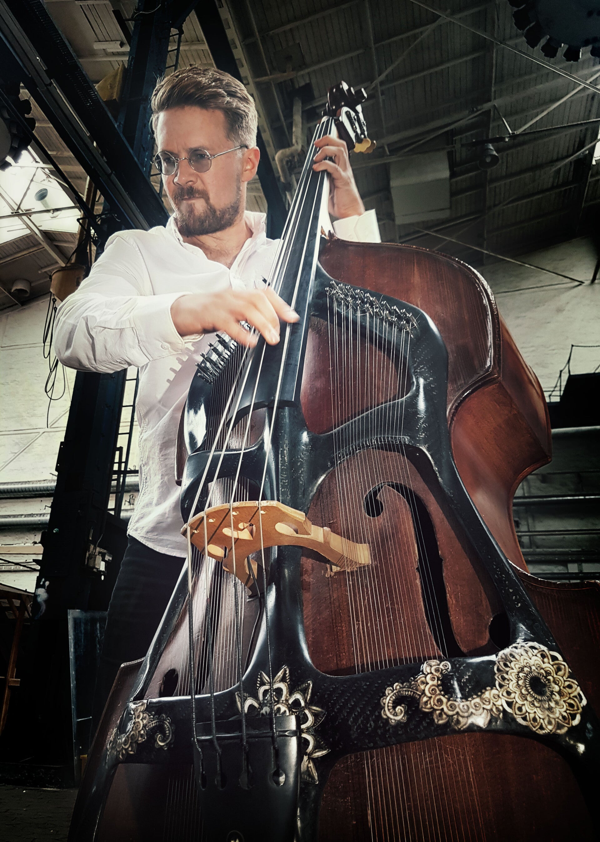 Le Swedish Harp Bass est bien plus qu'une simple modification ; c'est une réincarnation de la contrebasse. L'instrument, qu'Illerhag a finalisé vers 2019, est une fusion spectaculaire entre la contrebasse traditionnelle et une structure complexe en fibre de carbone imprimée en 3D. Inspiré par le "Nyckelharpa", un instrument folklorique suédois , cet ajout n'est pas seulement esthétique. Il permet d'ajouter 39 cordes sympathiques supplémentaires aux quatre cordes principales.