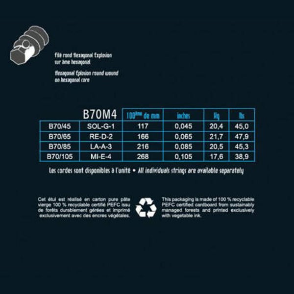 ·Les cordes pour guitare basse Hexagonal Explosion sont filées métal et plaquées nickel sur une âme hexagonale. Elles optimisent au maximum les qualités spécifiques du son et du feeling de l’âme hexagonale : réponse précise, projection rapide et puissance du son.