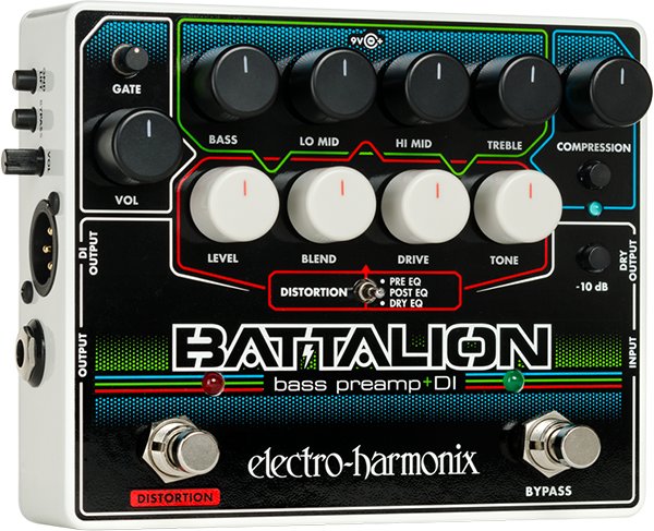 Le préampli basse Electro-Harmonix Battalion avec DI est une pédale compacte et polyvalente offrant de puissantes possibilités de modelage du son dans un format robuste et facile à intégrer à votre pedalboard. Le Battalion regorge de fonctionnalités qui séduiront les bassistes soucieux de leur son : égaliseur quatre bandes, section de distorsion MOSFET complète avec trois options de chemin de signal, compresseur, noise gate et connectique complète.
