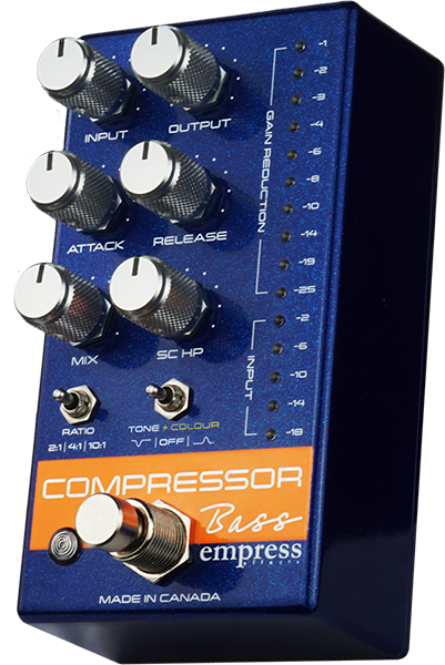 En plus des fonctionnalités et réglages que l'on trouve normalement sur les compresseurs de studio haut de gamme, comme un moniteur visuel de réduction de gain et d'entrée, des réglages indépendants d'attaque et de relâchement, un réglage Mix pour la compression en parallèle et un insert pour sidechain externe, nous avons rajouté un filtre de sidechain et un circuit Tone+Colour à 2 positions pour ajuster légèrement le son et donner de la distorsion harmonique, afin de donner à votre basse encore plus de caractère.