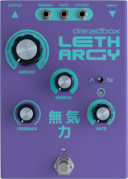 La pédale Dreadbox LETHARGY est un effet de déphasage basé sur un OTA, compatible avec les instruments à cordes frettées et les synthétiseurs, et offrant une compatibilité avec les systèmes Eurorack. Mais ce n'est pas tout : elle permet de contrôler l'équilibre entre le LFO et le réglage manuel du déphasage, et propose deux formes d'onde sélectionnables pour le LFO : triangulaire et carrée. Le contrôle de feedback permet de créer des sonorités allant d'un vibrato doux et d'effets de vibe à une distorsion extrême et saturée de feedback. Le contrôle de fréquence (Rate) de la pédale s'étend d'une vitesse très lente (d'où son nom) jusqu'à 110 Hz, ce qui la place dans le domaine de la FM. Ses trois points de patch offrent un contrôle CV des potentiomètres de réglage manuel et de fréquence, et fournissent une sortie LFO, faisant de la LETHARGY un outil idéal pour les passionnés de synthétiseurs.